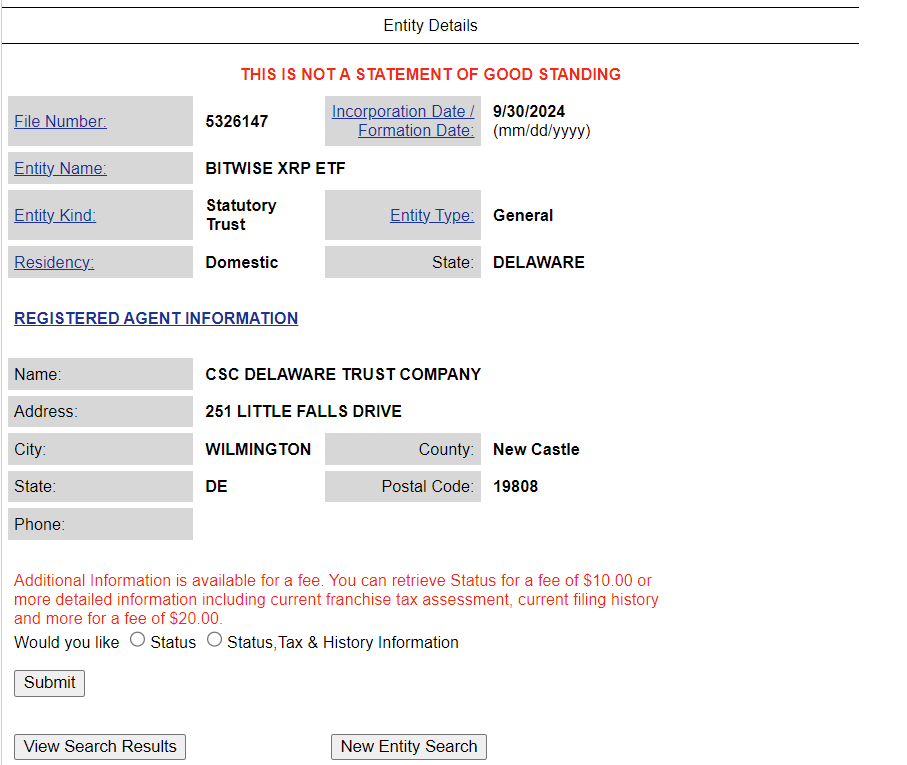 Varlık yöneticisi Bitwise, 30 Eylül'de Şirketler Bölümü'ne sunulan bir belgeye göre Delaware eyaletinde bir XRP ETF başvurusunda bulundu. Bitwise sözcüsü başvuruyu doğruladı.